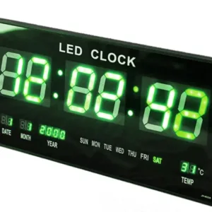 Ceasul digital de perete are LED-uri de culoare verde si afiseaza data, luna, ziua, anul, ora, minutul, secunda si temperatura in grade Celsius. Ora poate fi afisata in sistemele 12/24 ore si are are alarma si melodii.
