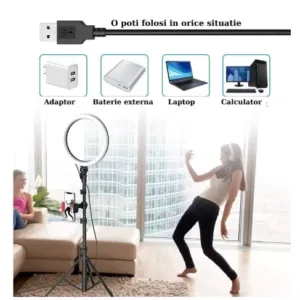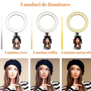 Lampa circulara LED Ring Light cu trepied este ideala pentru, machiaj, cosmetica, selfie-uri filmari si fotografii de grup in conditii de luminozitate scazuta, cu variator lumina Rece-Calda, cu Suport pentru Oglinda si Telefon, este un accesoriu ideal pentru fotografia de tip makeup, fashion, de studio, macro sau produs, perfect si pentru Make-up artisti, fotografi, Bloggeri, Vloggeri.